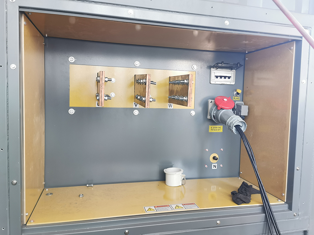 Specifications 100-2400KW Load Bank for Generator Load Test: 1.Premium components 2.Durable and reliable 3.Easy to transport 1. Resistive type of load, PF = 1.0. Stainless steel sheathed elements manufactured from high grade magnesium oxide. 2. Rated testing voltage: AC 3P4W, 110-480V 50/60 Hz. 3. Cooling mode: Forced air-cooled, fans mounted on the side of the load bank blow horizontally. Testing power or external utility power supply for fans. 4. Working mode: Load step control Total testing capacity ranges from 0kw to the max consisting of 10kw, 20kw, 50kw, 100kw load setting switches plus a 0-10kw fine-tuning knob. From 0kw to the max, any load combination is achievable. Load step resolution is 10kw. 5. Load bank features world-famous components to ensure reliable performance and longer service life including: SCHNEIDER contactors. Siemens switches, knobs and indicators. ABB Circuit breakers. OMRON intermediate relays. PHOENIX terminal blocks. 6. Parameter measuring accuracy grade: 0.3 7. Load control accuracy: ± 5%. 8. Load bank protections: Over heating protection, cooling fans failure protection and over load protection with alarm. 9. Control mode: Two control modes available: A)Local manual control; B)Optional: Manual control via a remote control panel (max control distance is 30m). 10. Parameter display and measurement: Control panel contains a LOVATO Multifunction Electricity Meter displaying voltage, current, load power, reactive power, apparent power, power factor, frequency etc. (Optional: A professional generator tester displays and measures all sorts of steady, dynamic parameters as well as harmonic wave, can be connected to a PC for data recording and test report printing). ” 11. Operating environment: Altitude: ≤ 3000m above sea level. Ambient temp: -10~+50 ℃ Relative humidity: ≤ 80% ventilated environment without explosive or corrosive dust. Not allowed to use in rainy outdoor environment. Any question, please contact me directly.
